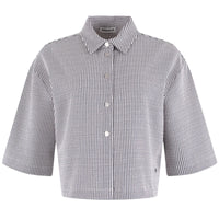 De jacket heeft een rechte pasvorm met korte mouwen en een klassieke kraag. De knoopsluiting aan de voorkant geeft het geheel een nette uitstraling, terwijl het cropped model zorgt voor een trendy twist. Het lichte materiaal draagt prettig en maakt de jacket perfect als extra laagje zonder dat het zwaar aanvoelt.