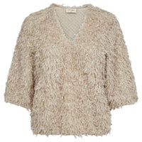 Beige franje v-hals blouse Nola van Freequent voor dames. Deze elegante blouse van Freequent is een echte eyecatcher dankzij de zachte velvetstof met speels franje effect. De stof heeft een subtiele glans en voelt heerlijk zacht aan, wat zorgt voor een vrouwelijke en stijlvolle uitstraling. De halve mouwen en de V-hals maken het model luchtig en flatterend, perfect voor zowel een casual als een chique look.