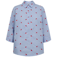 Blauw met rood heart embroidery shirt Rosan van Freequent voor dames. Deze lichtblauwe blouse met fijne streep is speels afgewerkt met geborduurde hartjes in een zachte lilac en rode tint. De subtiele combinatie van kleur en detail geeft het klassieke model een frisse, vrouwelijke uitstraling.