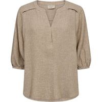 Morel Melange linnen v-hals blouse Lava van Freequent voor dames. Deze blouse heeft een warme en stijlvolle uitstraling dankzij de zachte morel melange kleur, die perfect past binnen een natuurlijke en tijdloze garderobe. De subtiele structuur van het linnen geeft het item een verfijnde en luchtige look, ideaal voor het voorjaar en de zomer.