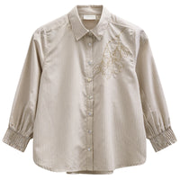 Het shirt heeft een klassieke kraag en een knoopsluiting aan de voorzijde waardoor het een nette en verzorgde uitstraling krijgt. De driekwart mouwen zijn afgewerkt met een elastische boord die zorgt voor een subtiel ballon effect. Dit geeft het model een speels detail terwijl het tegelijkertijd comfortabel blijft dragen.