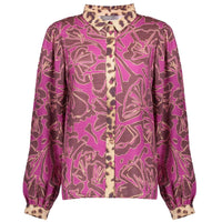 Roze geprinte panter blouse 53937 van Geisha voor dames. Deze opvallende blouse is een echte blikvanger dankzij de speelse mix van grafische bloemen en luipaardaccenten. De levendige combinatie van fuchsia en bruintinten geeft het ontwerp een stijlvolle, vrouwelijke uitstraling met een vleugje pit. De rechte pasvorm zorgt voor een soepel silhouet dat comfortabel zit en mooi valt. De klassieke kraag met luipaarddetail voegt een subtiele twist toe, waardoor de blouse zowel elegant als eigentijds oogt.