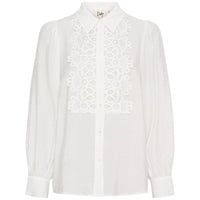 Het shirt is ontworpen met een klassieke kraag en sluit met knopen aan de voorzijde. Aan de voorkant is het shirt afgewerkt met een prachtig kanten paneel dat zorgt voor een vrouwelijk en stijlvol accent. De lange mouwen hebben een lichte pof en zijn afgewerkt met manchetten wat bijdraagt aan de elegante uitstraling. De pasvorm valt comfortabel en iets losser waardoor het shirt mooi langs het lichaam valt.