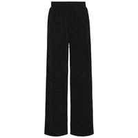 Zwart glinsterende broek Nareen van ICHI voor dames. Deze stijlvolle broek combineert een moderne uitstraling met ultiem draagcomfort. De subtiele glans in de stof zorgt voor een elegante en feestelijke look, perfect voor momenten waarop je moeiteloos wilt stralen. De elastische tailleband biedt een comfortabele pasvorm die zich soepel aan het lichaam aanpast. Dankzij de lange, ontspannen pijpen valt de Nareen broek mooi langs het lichaam en creëert hij een flatterend silhouet.