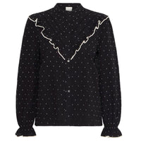 Zwarte blouse Zady van ICHI voor dames. Deze blouse is voorzien van een opstaande kraag en lange mouwen met elastische manchetten. De blouse heeft een zwarte kleur met witte stippen en ruffeltjes als extra detail. Gemaakt van 100% katoen. De blouse is te sluiten via knoopjes en is leuk voor elke gelegenheid.