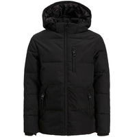 Zwarte hood puffer jacket Owen van Jack & Jones voor jongens. Deze gewatteerde jas is een stoere en praktische keuze voor koude dagen. Uitgevoerd in een tijdloze zwarte kleur en gemaakt van stevig geweven materiaal, biedt de Owen puffer optimale warmte en duurzaamheid. De vaste capuchon en lange mouwen met comfortabele boorden zorgen voor extra bescherming tegen wind en kou, terwijl de lichtgewicht vulling ervoor zorgt dat de jas warm is zonder zwaar aan te voelen.