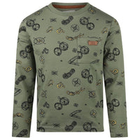 Groen geprinte longsleeve O56887 van Koko Noko voor jongens. Dit stoere shirt met lange mouwen is ideaal voor kinderen die houden van avontuur en plezier. De groene basiskleur in combinatie met de opvallende print zorgt voor een eigentijdse uitstraling die past bij elke speelse garderobe. Het borstzakje geeft de longsleeve een extra stoer detail en maakt het design net wat specialer.