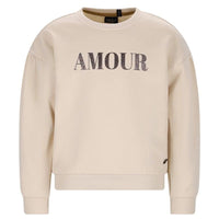 Beige kit sweater met print Danee van Like Flo voor meiden. De Danee sweater is een trendy en comfortabele toevoeging aan de garderobe van iedere meid. Het zachte katoen voelt prettig aan op de huid, terwijl de speelse glitterprint met het woord ‘amour’ een vrolijk en modieus accent toevoegt. De relaxte dropped shoulder fit zorgt voor een casual, comfortabele pasvorm die ideaal is voor actieve dagen.