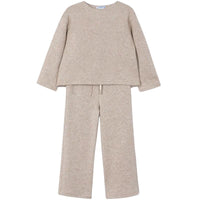 De bijpassende broek heeft een elastische tailleband met verstelbaar koord, zodat de pasvorm altijd prettig en flexibel blijft. De zachte gebreide stof voelt warm en soepel aan, ideaal voor de koudere maanden. Zowel de trui als de broek zijn gemaakt van een hoogwaardige knitkwaliteit die comfortabel aanvoelt op de huid en makkelijk te onderhouden is.