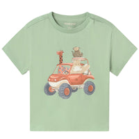 Matchagroen vehicle korte mouw t-shirt 1010 van Mayoral voor jongens. Dit zomerse t-shirt van Mayoral heeft een frisse en speelse uitstraling dankzij de zachte matchagroene kleur en de vrolijke print op de voorkant. De katoenkwaliteit voelt zacht aan en zorgt voor een comfortabel draaggevoel, ideaal voor warme dagen. De print met dieren in een stoer voertuig maakt het shirt extra leuk voor jongens.