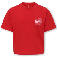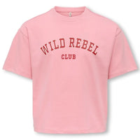 Lichtroze geprint t-shirt Jasmine van ONLY voor meiden. Dit vrolijke shirt brengt kleur in elke garderobe en is perfect voor meiden die houden van een stoere, maar speelse look. Het model heeft een klassieke ronde hals en korte mouwen, wat zorgt voor een comfortabele en tijdloze pasvorm. De rode opdruk met tekst op de borst geeft het t-shirt een opvallend accent en maakt het een echte blikvanger, zonder te overdrijven.