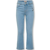 Light Blue Denim flared jeans Royal Flower van ONLY voor meisjes. Deze lichtblauwe flared jeans is een vrolijke en moderne toevoeging aan de garderobe van elke meid. Het model heeft een tijdloze denimlook met een subtiele uitlopende pijp, waardoor het silhouet een speelse en eigentijdse uitstraling krijgt. De denim voelt soepel aan en biedt voldoende stretch, zodat de broek comfortabel meebeweegt tijdens het spelen, sporten of relaxen. Dankzij de lichte wassing is deze jeans ideaal voor zowel casual outfits als meer verzorgde looks.
