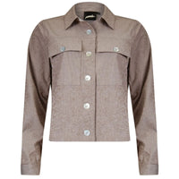 Taupe bruine contrast jacket 613141 van Poools voor dames. Deze stijlvolle jacket heeft een moderne en verfijnde uitstraling dankzij de subtiele structuur in de stof en de mooie taupe bruine kleur. De borstzakken en opvallende knopen geven het item een stoere, maar toch vrouwelijke look, waardoor het perfect past binnen een eigentijdse garderobe.