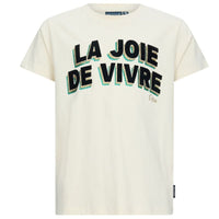 Beige tekstprint t-shirt Nilda van Retour Jeans voor meiden. Dit trendy shirt uit de wintercollectie brengt een positieve en speelse vibe in de garderobe van jouw dochter. Het model heeft een klassieke ronde hals en korte mouwen, waardoor het een veelzijdige basic is die altijd goed van pas komt. De opvallende “La Joie de Vivre” print op de borst zorgt voor een vrolijke uitstraling en maakt dit t-shirt een echte eyecatcher.