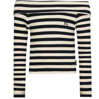 Zwart gestreepte off shoulder top Esra van Retour Jeans voor meiden. Deze stijlvolle top is een echte blikvanger en combineert moeiteloos een trendy look met draagcomfort. Het off shoulder model geeft de top een speelse en vrouwelijke uitstraling, terwijl het zwart-wit streepdessin zorgt voor een tijdloos en modern effect. Het subtiele RJ-logo op de borst maakt het geheel af en benadrukt de herkenbare Retour Jeans stijl.