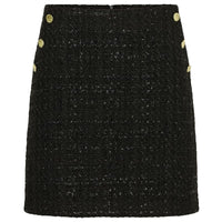 Zwarte bouclé glitter rok Nigella van Saint Tropez voor dames. Deze stijlvolle rok is een echte eyecatcher dankzij de luxueuze boucléstructuur en subtiele glinstering die het geheel een elegante uitstraling geven. De gouden knopen aan de voorkant voegen een chique, klassieke touch toe die perfect past bij de verfijnde stijl van Saint Tropez. De rok heeft een flatterende, iets rechte pasvorm die mooi om het lichaam valt en zowel comfortabel als vrouwelijk oogt.