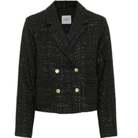 Zwarte korte blazerjacket Nigella van Saint Tropez voor dames. Deze stijlvolle blazer is de perfecte combinatie van elegantie en moderne klasse. Het korte double-breasted model met een boxy pasvorm geeft de blazer een eigentijdse uitstraling die zowel zakelijk als casual gedragen kan worden. De subtiel gestructureerde stof voelt luxe aan en geeft het ontwerp extra diepte, terwijl de reverskraag en de vier metalen knopen zorgen voor een verfijnde afwerking.