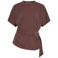 Chocoladebruin met zilveren top Gelia van Sisters Point voor dames. Deze feestelijke top is ontworpen in een glanzende chocoladebruine tint die prachtig wordt gecombineerd met subtiele zilveren details. Het metallic effect zorgt voor een luxe uitstraling, terwijl de soepele stof comfortabel meebeweegt en licht aanvoelt op de huid. De top heeft een vrouwelijke pasvorm die mooi volgt zonder strak te zitten, waardoor hij ideaal is voor zowel feestelijke gelegenheden als een avondje uit.