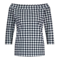 Donkerblauwe top Dolly check van Studio Anneloes voor dames. De Dolly check top van Studio Anneloes is vrouwelijk en stijlvol met een speelse ruitenprint in Dark Blue en Off White. De boothals met off shoulder detail geeft een elegante twist. Gemaakt van kreukvrije Medium Travelstof, met driekwart mouwen en een regular fit. Ideaal voor zowel werk als vrije tijd!