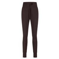 Espresso slim fit travel broek Franka van Studio Anneloes voor dames. De espresso Franka trousers van Studio Anneloes is een stijlvolle broek die elegantie en warmte uitstraalt. De diepe bruine tint geeft een luxe uitstraling, terwijl de slim fit pasvorm zorgt voor een krachtig en vrouwelijk silhouet. De brede tailleband zonder elastiek en de drawstring sluiting bieden een comfortabele fit, terwijl de cuffs bij de enkel en de middenvoornaad op het been zorgen voor een sportieve en verzorgde look.