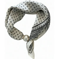 X white black parel sjaaltje Chloe van Tim & Simonsen voor dames. Dit stijlvolle sjaaltje heeft een tijdloos zwart wit dessin met speelse grafische details die zorgen voor een moderne en elegante uitstraling. De subtiele parel als sluiting geeft het geheel een verfijnde touch en maakt het sjaaltje net even anders dan een klassiek model. Door het compacte formaat is het een perfect accessoire om elke outfit op een subtiele manier af te maken.