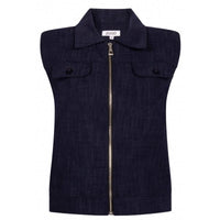 Donkerblauwe jacket Veronique van ZOSO voor dames. Dit denim gilet met ritssluiting en kraagje geeft iedere outfit een stoere twist. De fake borstzakjes zorgen voor een stijlvolle afwerking. Perfect te combineren met de tops uit de ZOSO collectie voor een complete look. Een veelzijdig item dat je zowel casual als trendy kunt dragen.
