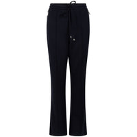 Night Blue luxury modal broek Maud van ZOSO voor dames. Deze elegante broek heeft een moderne en vrouwelijke uitstraling dankzij de diepe donkerblauwe kleur en de soepel vallende rechte pijpen. De elastische tailleband met strikkoord zorgt voor extra comfort en geeft het model een subtiele sportieve touch. De minimalistische afwerking en strakke belijning maken deze broek tijdloos en veelzijdig.