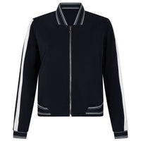 Night Blue sporty travel jacket Tyler van ZOSO voor dames. Dit sportieve jasje heeft een krachtige en tijdloze uitstraling dankzij de diepe donkerblauwe kleur en de subtiele contrastdetails bij de boorden en kraag. De ritssluiting aan de voorzijde zorgt voor een strakke en moderne afwerking. De lichte strepen langs de mouwen geven het ontwerp een dynamische en eigentijdse twist die perfect aansluit bij de herkenbare sportieve stijl van ZOSO.